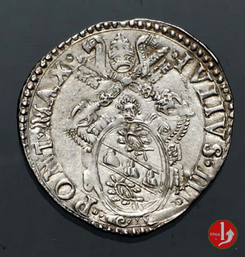 Giulio (S.Pietro) - Stemma stretto e chiavi erette Dritto: IVLIVS •III •__ •PONT •MAX • / Stemma ovale ornato di volute e maschera, cimasa con sopra due globetti, sormontato da chiavi dec. e tiara. (stemma ovale piú oblungo e stretto). Verso: ^S^PETRVS^__ ![]() ^ANCONA^ / S.Pietro con nimbo circolare, in piedi di fronte, testa rivolta a destra tiene con la mano destra le chiavi erette e nella sinistra il libro aperto in atto di lettura | |