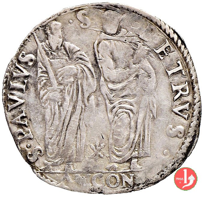 Giulio (S.Pietro e S.Paolo) Dritto: •IVLIVS •III__ •PONT •MAX • /Stemma ovale ornato di volute e mascher, sormontato da chiavi dec. e tiara Verso: S •PAVLVS__ •S •__ •PETRVS • /S.Paolo a sinistra e S.Pietro a destra nimbati in piedi di fronte, Paolo con spada nella destra guarda Pietro con chiavi nella destra e libro nella sinistra; in basso tra le figure ![]() ; in Esergo ANCONA | |