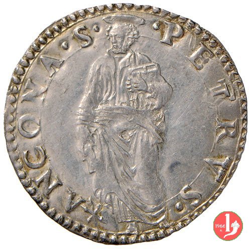 Giulio (S.Pietro) - Stemma a targa Obverse: IVLIVS^III^__^PONT^MAX^ /Stemma a targa con ornati e sopra un fiore a globo, sormontato da chiavi dec. e tiara Reverse: •S •PETRVS •__ ![]() ANCONA • / S.Pietro con nimbo circolare in piedi di fronte, chiavi pendenti nella destra e libro nella sinistra stretto contro il petto. | |