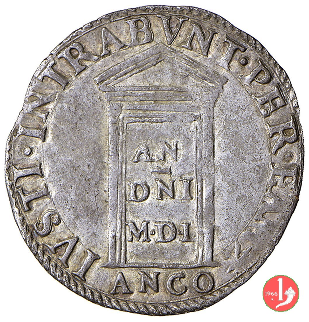 Giulio (Porta Santa) Obverse: •IVLIVS •III •__PONT •MAX • /Stemma ovale, ornato di volute e maschera, sormontato da chiavi dec. e tiara Reverse: IVSTI •INTRABVNT •PER •EAM ![]() /Porta Santa sormontata da timpano; all'interno AN|| -||DNI||M •D •L|| in Esergo ANCO | |