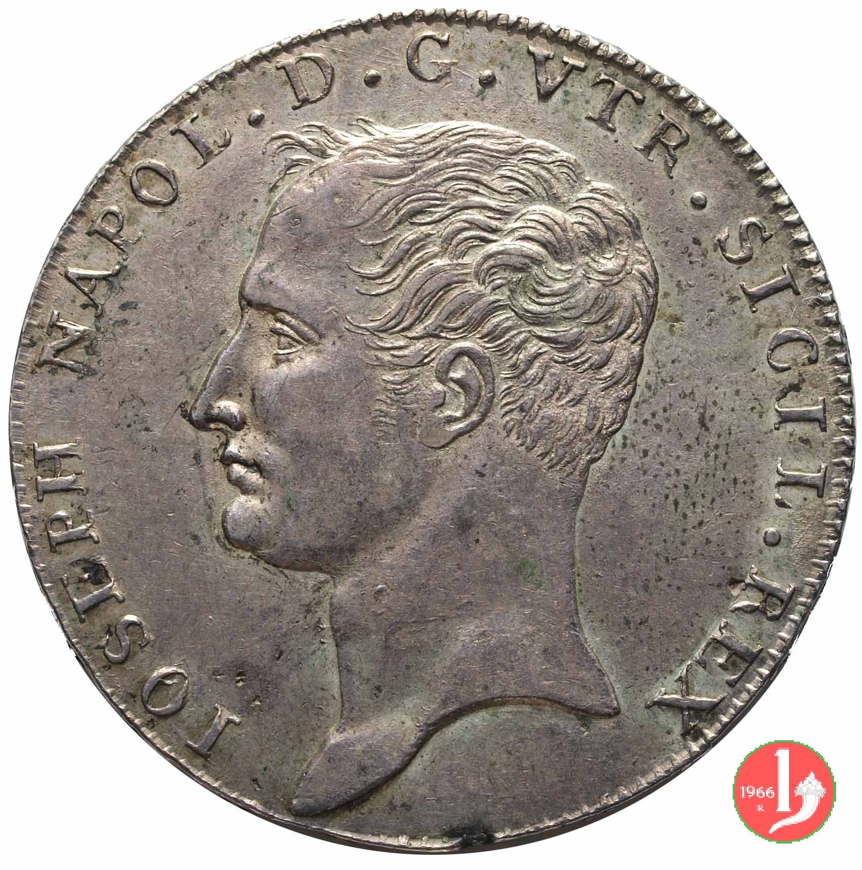 120 grana o piastra Dritto: Testa del Re a sinistra, intorno: IOSEPH.(us) NAPOL.(is) D.(ei) G.(ratia) VTR. SICIL.(iae) REX. Verso: Stemma coronato con introno: PRINC. GALLIC. MAGN. ELECT. IMP. Sotto la data e il valore (G. 120). |