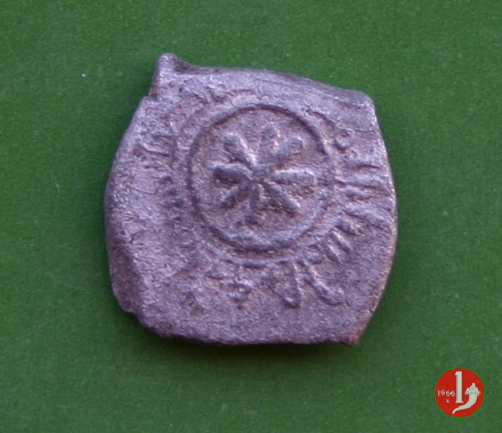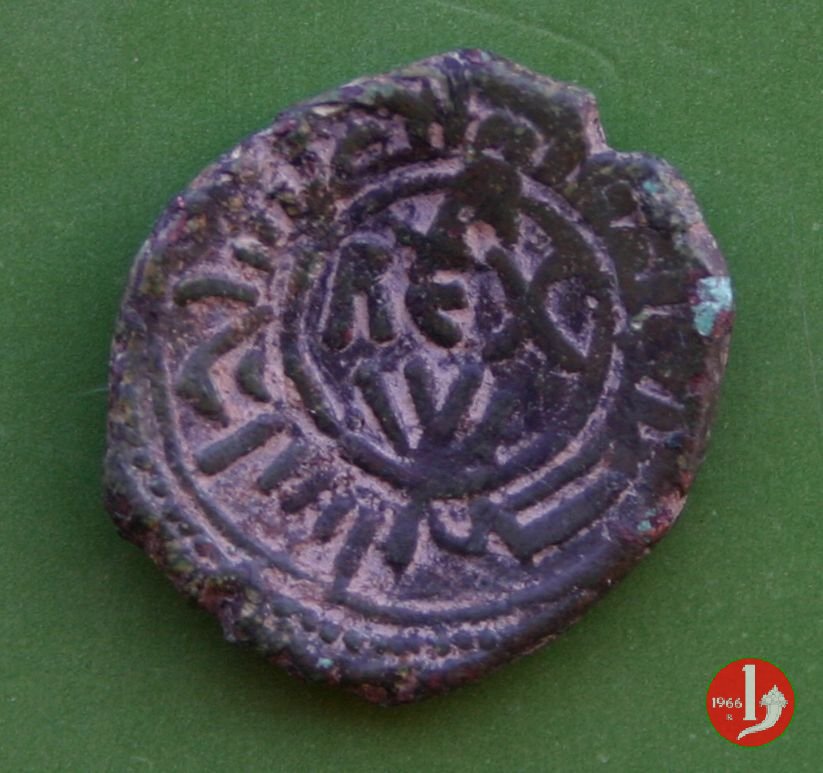 Frazione di Dirhem - Kharruba Dritto: Iscrizione araba in tre righe "Il re Guglielmo il magnifico" con giglio tra la prima e la seconda riga, entro cerchio perlinato. Verso: Stella a otto raggi in centro; intorno legenda araba "Coniato l'anno terzo cinquantesimo cinquecentesimo" entro cerchio perlinato. | |