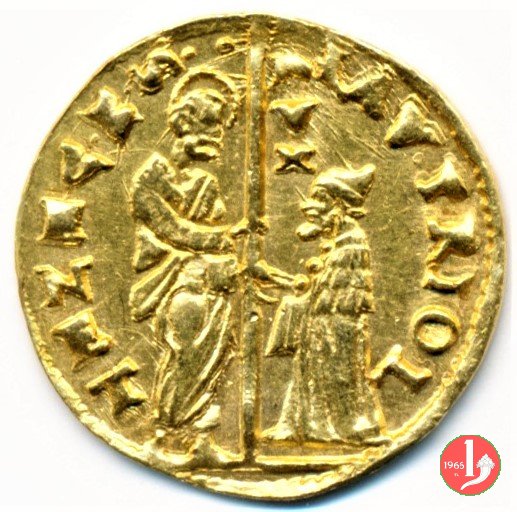 Zecchino Dritto: (globetto) LAV (globetto) PRIOL (globetto) S (globetto) M (globetto) VENET, San Marco stante a destra e il doge inginocchiato a sinistra reggono il vessillo, lungo l'asta DVX Verso: SIT (globetto) T (globetto) XPE (globetto) DAT Q TV REGIS (globetto) ISTE (globetto) DVCAT, il Redentore stante in mandorla di perline con 12 stelle | |