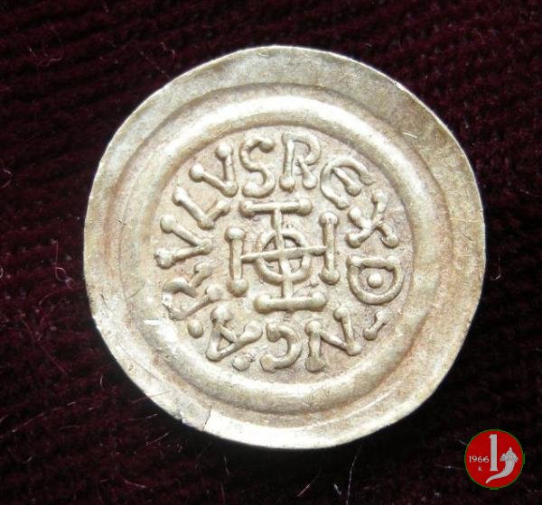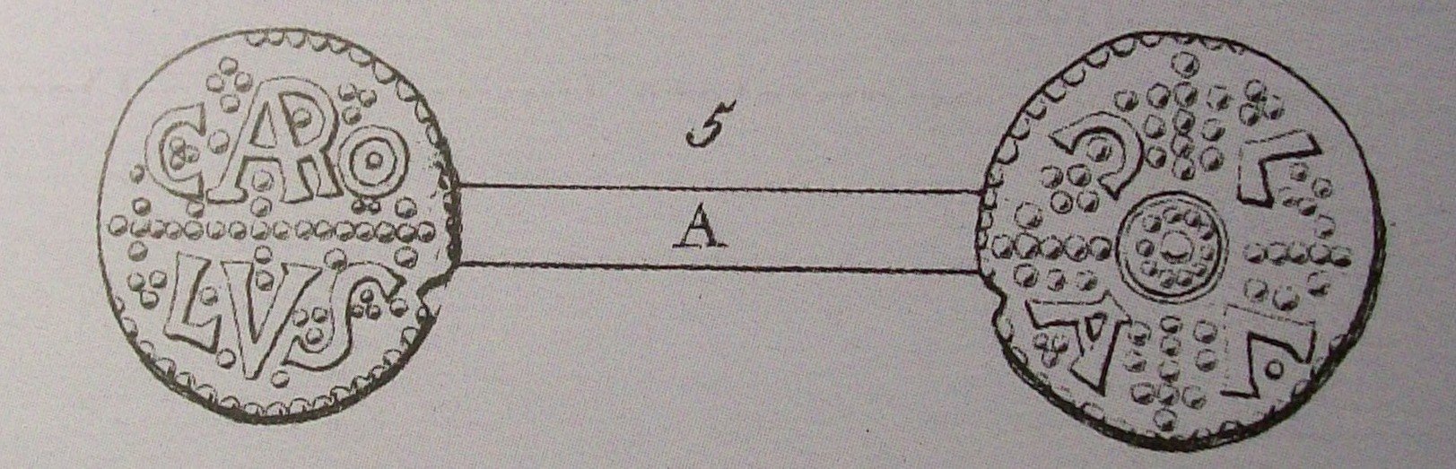 denaro Dritto: CAROLVS a tutto campo su due linee, diviso da croce formata da perline. Le lettere sono intercalate da croci formate da perline attorno a bisante centrale composto da dieci perline. | |