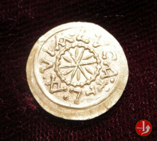 tremisse Dritto: DN C • A • RVLVS REX Piccola croce potenziata con cerchio al centro. Stella a sei raggi accantonata da sei fogliette. | |