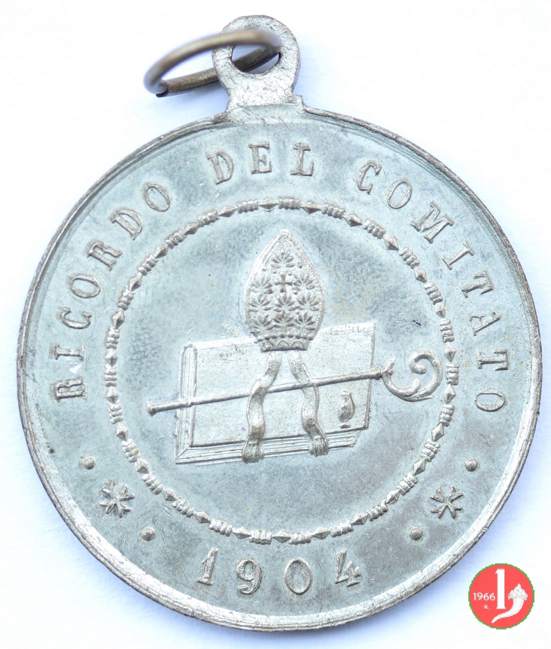 Atripalda - San Sabino Vescovo 1904 Dritto: S. SABINO VESCOVO - PATRONO DI ATRIPALDA * busto benedicente di fronte con mitra, piviale e pastorale su piedistallo con volute entro cornice circolare perlinata: mitra su pastorale e messale chiuso | |