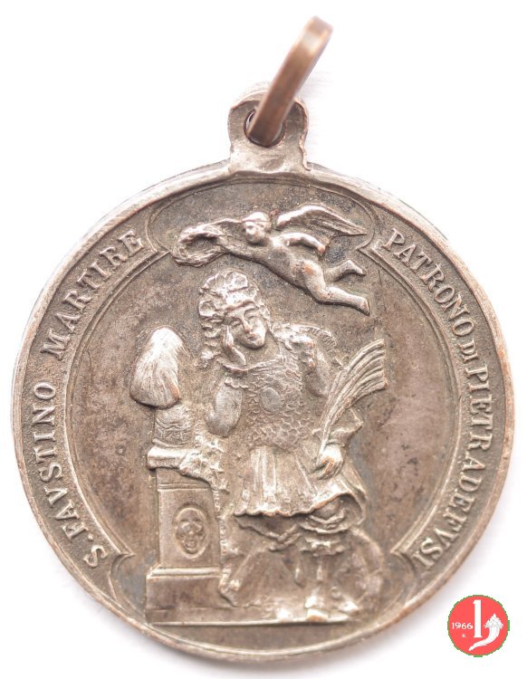 Pietradefusi - Corpo Musicale del Governatorato 1926 Dritto: S. FAVSTINO MARTIRE _ PATRONO DI PIETRADEFVSI il Santo seduto di fronte e assorto presso cippo regge ramo di palma ed è coronato con serto da angelo nel campo: torre con leone (simbolo della città) e lupa su fascio verticale (simbolo del governatorato di Roma) | |