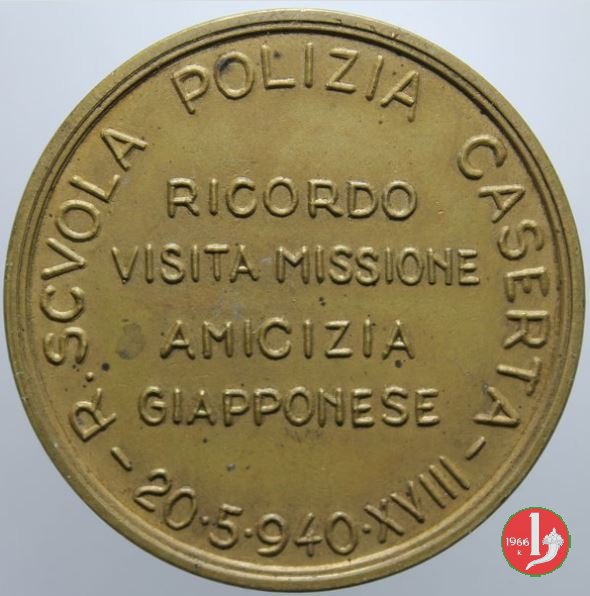 Scuola di Polizia 1940 Dritto: Aquila Savoia coronata su fascio orizzontale e nastro Verso: R. SCVOLA POLIZIA CASERTA = - 20 • 5 • 940 • XVIII - nel campo: RICORDO = VISITA MISSIONE = AMICIZIA = GIAPPONESE | |