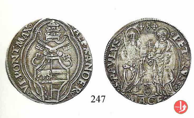 Grosso Dritto: °ALEXANDER°__°VI°PONT°MAX / Stemma ottagono sormontato da chiavi dec. con cordone e da tiara, entro 4 centine lineari doppie Verso: (dal baso a sinistra) °S°PAVLVS°__+S+__°PETRVS° ![]() /S.Paolo e S.Pietro in piedi di fronte nimbati; Paolo a sinistra con spada eretta e libro, Pietro a destra con chiavi erette e libro; nel campo in basso ![]() , in Esergo °MACE° |