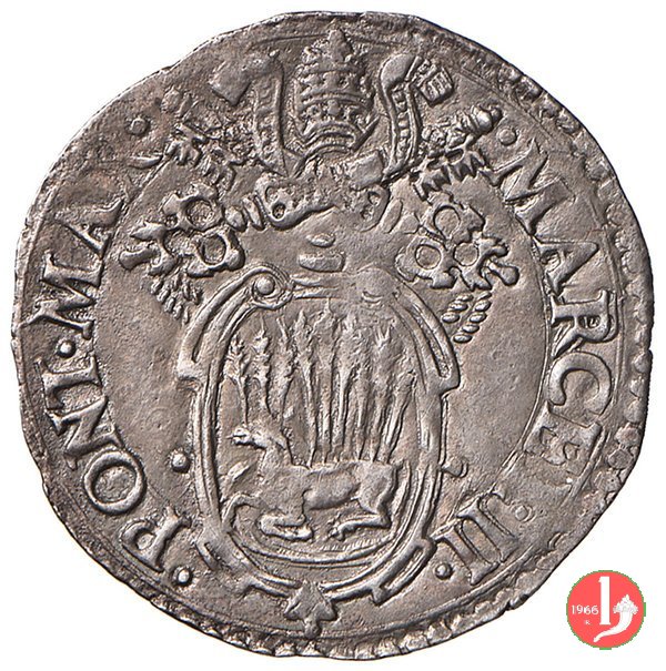 Giulio (Spighe sciolte) Dritto: MARCEL •II •__ •PON •MAX • /Stemma ovale con 9 spighe sciolte, sormontato da chiavi dec. e tiara Verso: •S •PETRVS •__ ![]() ANCONA • /S.Pietro nimbato, in piedi di fronte, testa volta a sinistra, chiavi nella destra pendente e libro nella sinistra | |