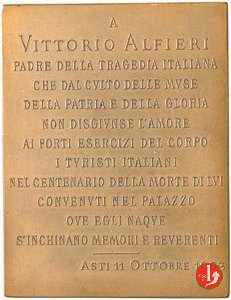 Verso: nel campo: A = VITTORIO ALFIERI = PADRE DELLA TRAGEDIA ITALIANA = CHE DAL CVLTO DELLE MVSE = DELLA PATRIA E DELLA GLORIA = NON DISGIVNSE L'AMORE = AI FORTI ESERCIZI DEL CORPO = I TVRISTI ITALIANI = NEL CENTENARIO DELLA MORTE DI LVI = CONVENVTI NEL PALAZZO = OVE EGLI NACQVE = S'INCHINANO MEMORI E REVERENTI = • • • = ASTI 11 OTTOBRE 1903