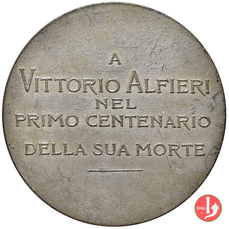 Verso: nel campo: A = VITTORIO ALFIERI = NEL = PRIMO CENTENARIO = DELLA SUA MORTE = -