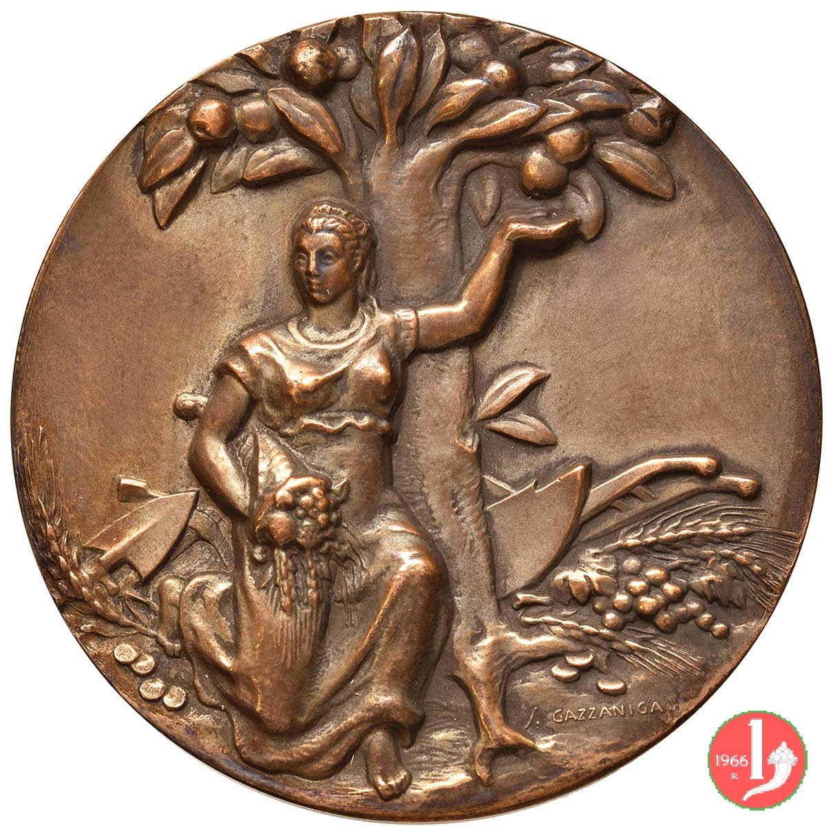 Dritto: la figura femminile seminuda dell'economia del risparmio seduta di fronte e volta a dx, presso salvadanaio, protende la mano a dx e lascia cadere monete su frutti, sullo sfondo imbocco di galleria e ponte