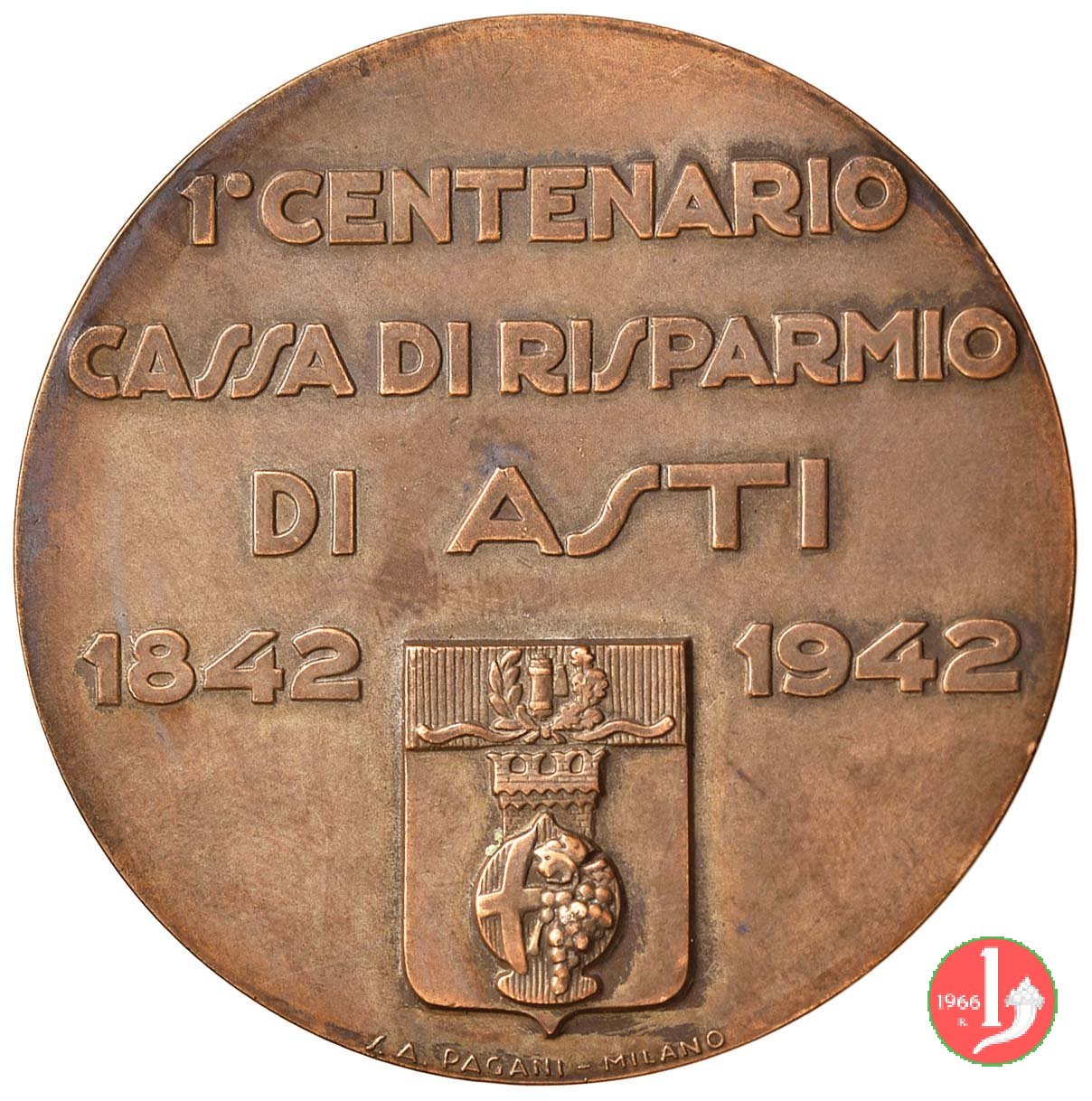 Verso: nel campo: 1° CENTENARIO = CASSA DI RISPARMIO = DI ASTI = 1942 = stemma della Città
