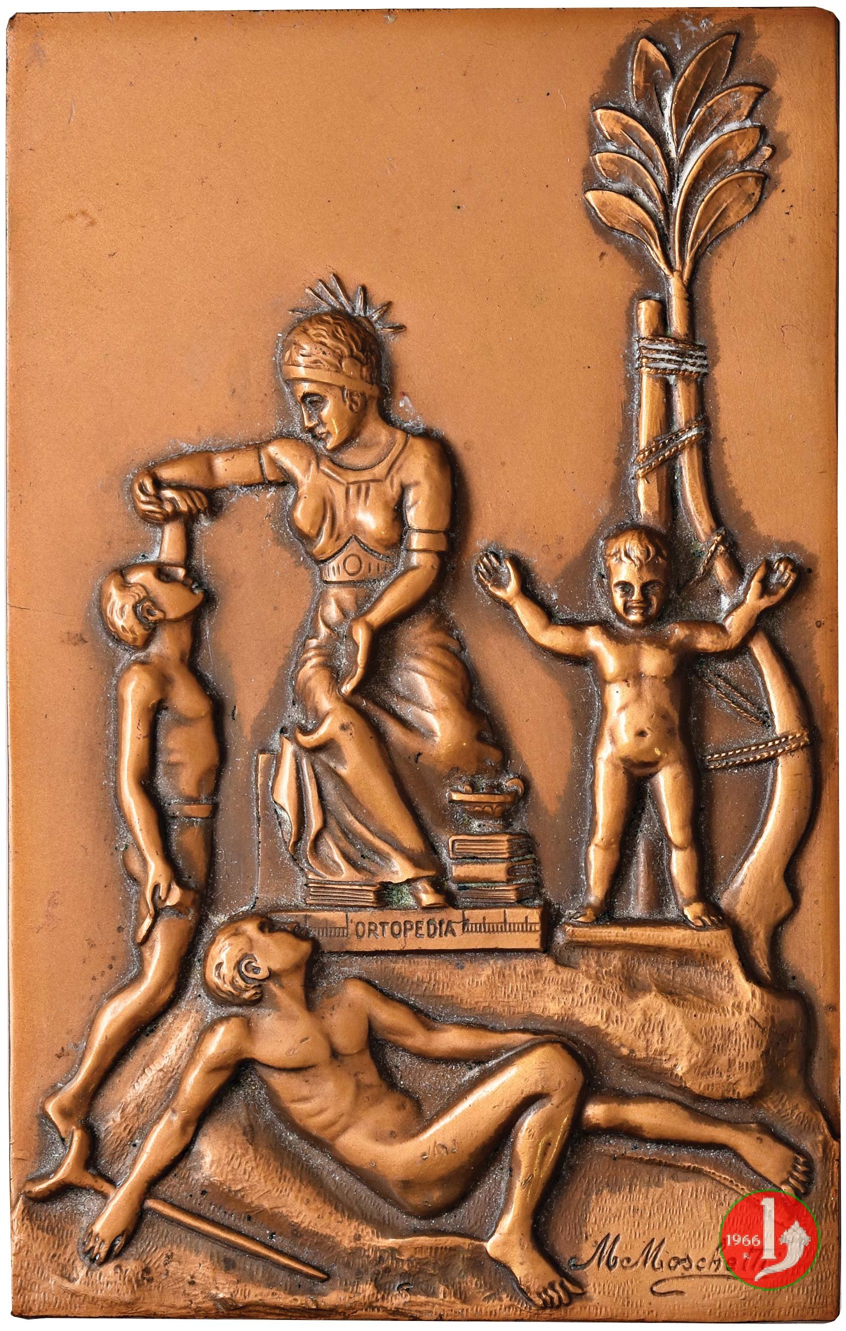 Dritto: Figura allegorica dell'Ortopedia, seduta su base, presso pianta officinale e bimbo in piedi, cura pazienti nudi con stampelle;