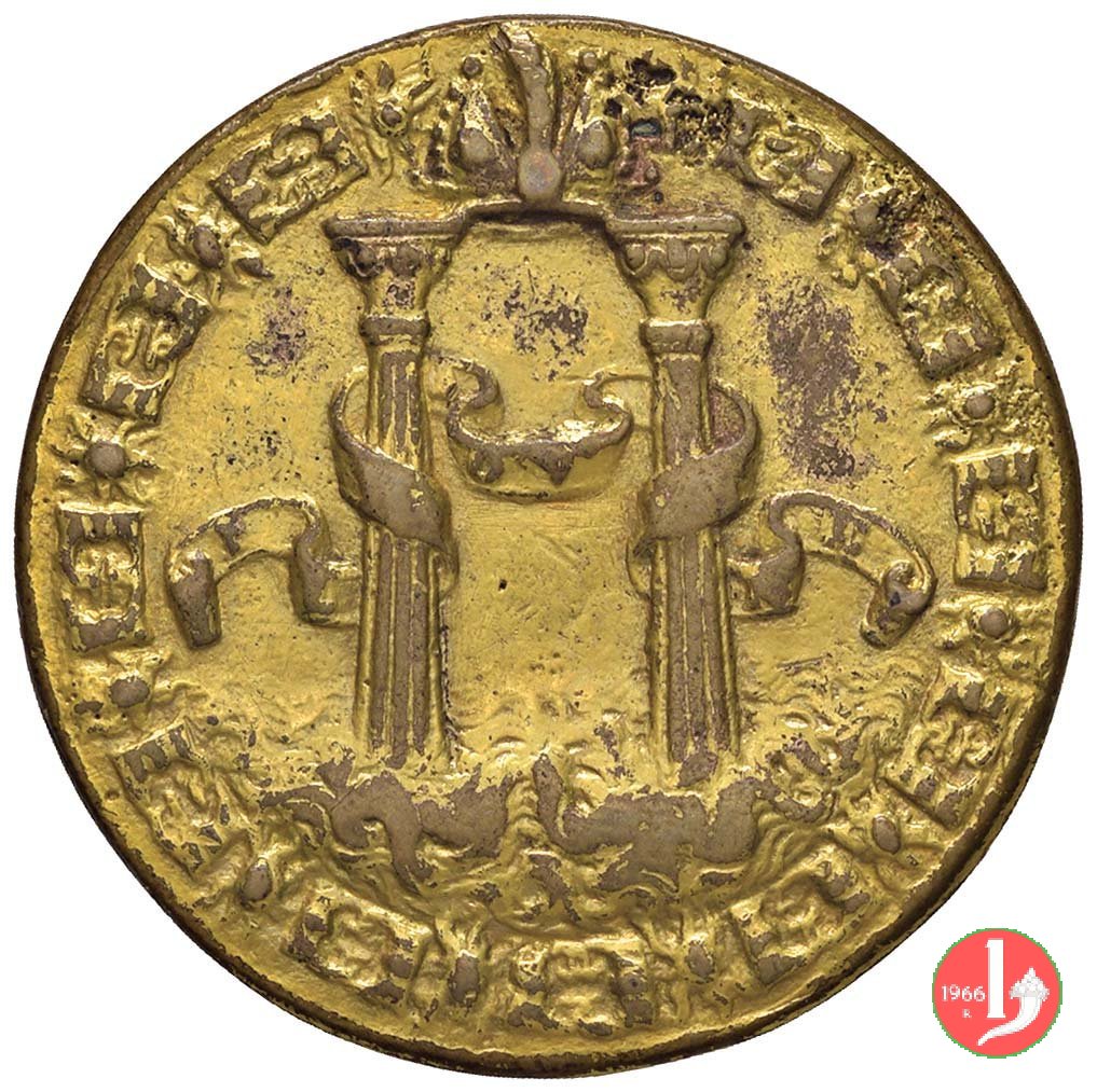 Verso: le colonne d'Ercole legate da nastro PL _ VS _ OV _ LT _ RE, entro ghirlanda di fiori e nodi alternati (collare del Toson d'Oro)