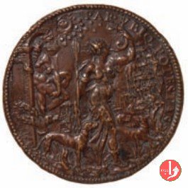 (Ippolita raffigurata come) Diana suona i corno e cammina in un bosco verso dx; attorno tre cani: Plutone, Proserpina e Cerbero