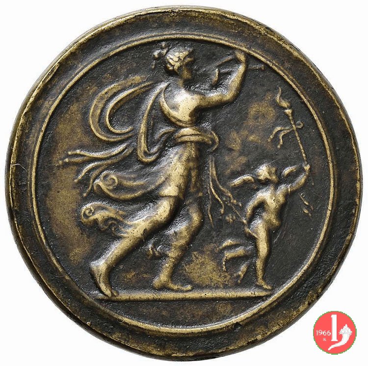 Verso: figura allegorica drappeggiata volta a dx con flauto e putto con torcia
