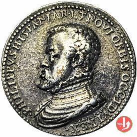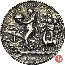 Filippo II -Colonie in India Dritto: • PHILIPPVS HISPANIAR • ET NOVI ORBIS OCCIDVL REX • busto corazzato a sx con mantello la fortuna in piedi, volta a sx, regge globo, seguita da gruppo di figure del nuovo mondo e da un lama sullo sfondo, a sx: flotta navale in esergo: INDIA | |