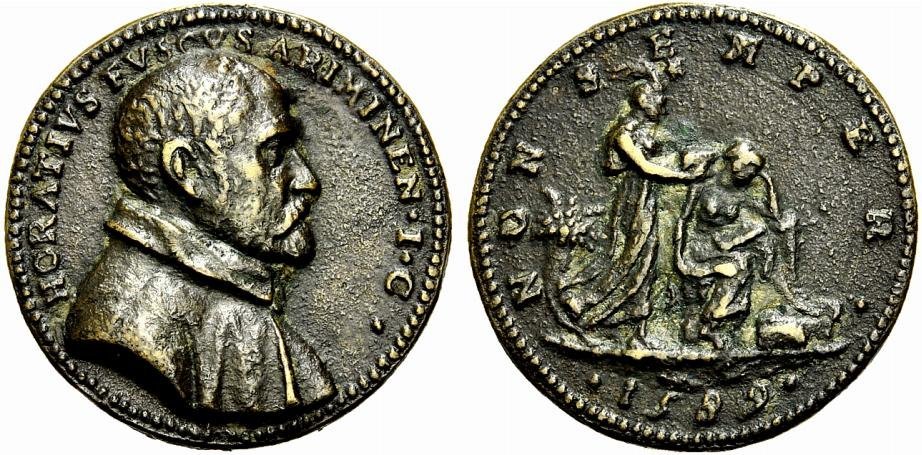 Orazio Fuschi -VT1499 Dritto: HORATIVS FVSCVS ARIMINEN • I • C • busto a dx con camice su taglio busto: D • P due figure femminili allegoriche della consolazione e cornucopia a sx in esergo: • 1589 • | |