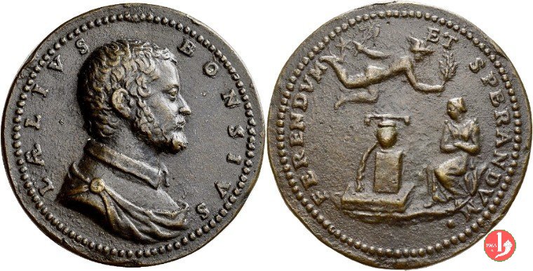 Lelio Bonsi Dritto: LAELIVS _ BONSIVS busto a dx con mantello e camicia Mercurio, in volo verso dx, protende ramo di ulivo verso donna seduta verso sx, presso una fonte | |