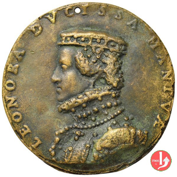 Eleonora d' Austria 1561 -M52 Dritto: LEONORA DVCISSA MANTVAE busto a sx con cappello gemmato ed alto collare ornato da perle sul taglio spalla: 1561 | |