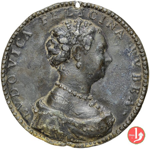 Ludovica Felicini 1557 -VT1052 Dritto: LVDOVICA FELICINA RVBEA • busto a dx con capelli raccolti sul capo da fili di perle e collana di perle con croce sul taglio spalla: 1557 • P • | |