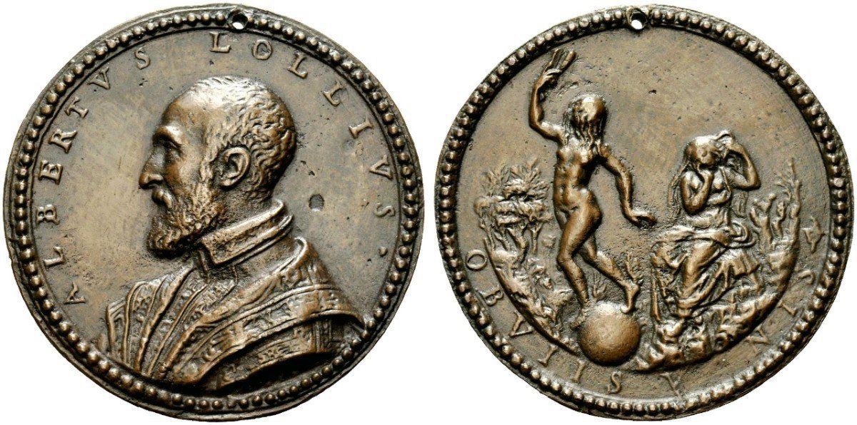 Alberto Lollio 1562 -VT1060 Dritto: ALBERTVS LOLLIVS. busto a sx Ccon abito e soprabito ricamati sul taglio del busto: P. 1562 la figura allegorica della Fortuna, nuda ed in piedi su globo, si allontana da figuara addolorata | |