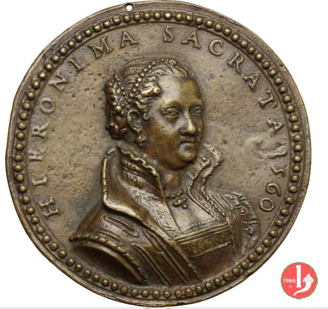 Girolama Sacrata 1560 -VT1949 Dritto: HIERONIMA SACRATA 1560 busto di 3/4 a dx con capelli raccolti in trecce e fili di perle, pendente a croce e abito ricamato e soprabito sul taglio spalla: P | |