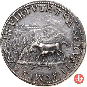 Ippolito II d'Este 1552 Dritto: HIPPOLITVS ESTENS CARD • FERRAR • busto a dx con barba e mozzetta sul taglio: D • P • giovane paludato e seduto verso dx su sedia con giglio, tiene al guinzaglio lupa (Siena) | |