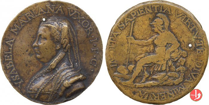 Isabella Mariani Carcass Dritto: YSABELA MARIANA VXOR • I • F • C • busto a sx con velo bordato da perle ricadenti sulle spalle Minerva seduta verso sx | |