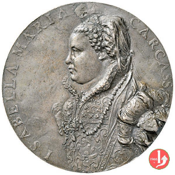 Isabella Rammi 1556 Dritto: • ISABELLA RAM • D • EST • MDLVI • busto a dx con veste finemente ordita e capelli raccolti dietro alla nuca da trecce sul taglio spalla: P sotto: OBVIIS VLNIS | |