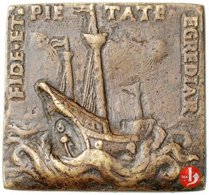 Omaggio ad Ercole II d'Este -B113 Dritto: COS • ET • RATIOIB • GALL • SEREN • DVC • FERR • CARN • ET • C • Stemma d'Este coronato e racchiuso in collare imbarcazione con vele ammainate e figura a prua, sullo sfondo catena montuosa e in alto cielo stellato | |
