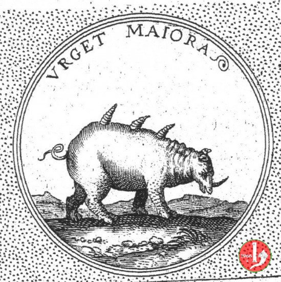 Ippolito II d' Este Sigillo 1509-1572 -B89 Dritto: HIPPOLITVS ESTEN • S • MARIAE IN AQVIRO DIACONVS CAR • FERRARIEN • campo diviso in due parti da piedritto portante arcata nel campo, a sx: Sant'Ambrogio su cavallo rampante a sx nel campo, a dx: San Giovanni, nimbato, in piedi su roccia, regge Croce astile e protende mano verso il cielo, sotto vari personaggi in esergo: Stemma sormontato da galero tra quattro figure nude recanti cornucipie | |