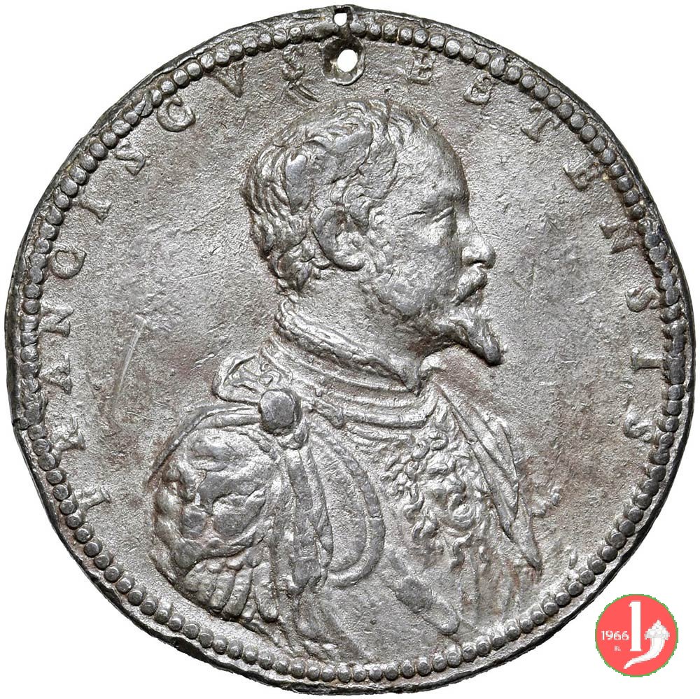 Francesco d'Este -B92 Dritto: FRANCISCVS ESTENSIS busto corazzato a dx con mantello e testa di medusa sul petto in esergo: PARI ANIMO | |