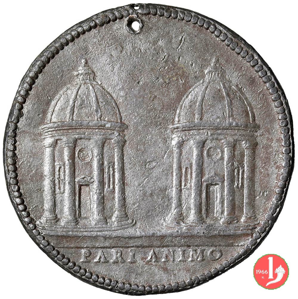 Annibale d'Este -B99 Dritto: • ANIBAL ESTENSIS • A • A • XIIII busto corazzato a dx sul taglio spalla: 1556 la morte in piedi, volta a dx, viene fermata da giovane, a dx assistono alla scena i due genitori del fanciullo | |