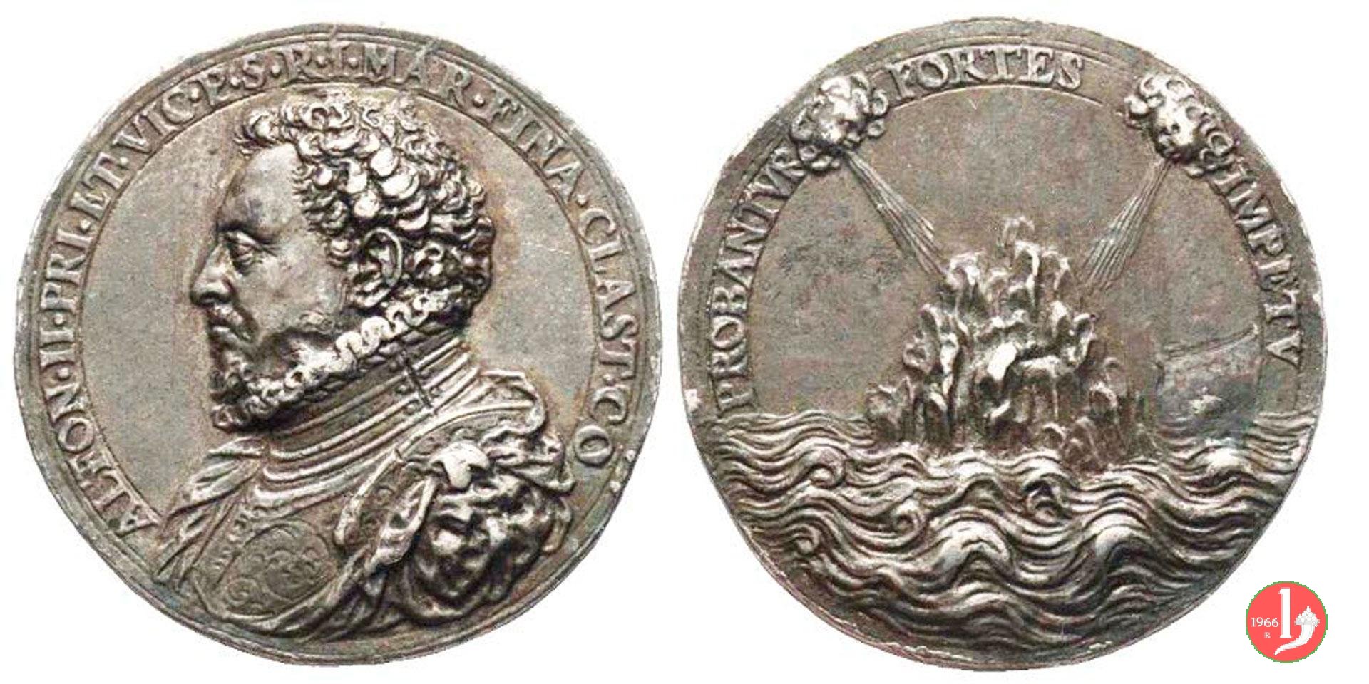 Alfonso II del Carretto -A165var Obverse: ALFON • II • PRI • ET • VIC • P • S • R • I • MAR • FINA • CLAST • CO busto corazzato e paludato a sx Scoglio entro mare agitato tra le teste di due venti che soffiano ai lati | |