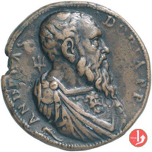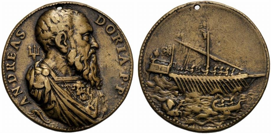 Antonio Doria 1570 Obverse: ANTONIVS DORIA AET LXXV busto corazzato a dx le figura allegoriche di Marte corazzato ed elmato con scudo e Nettuno nudo con tridente, presso cavallo marino, in piedi | |