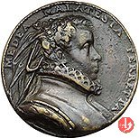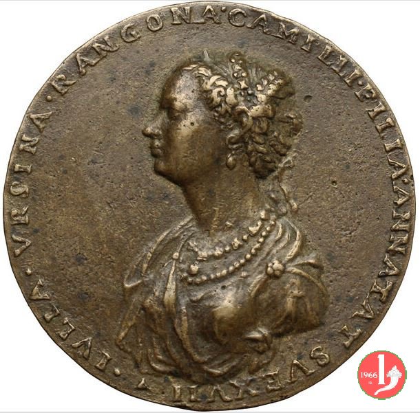 Giulia Orsini 1554 Dritto: IVLIA • VRSINA • RANGONA • CAMILLI • FILIA • ANN • ATAT • SVE • XVII • busto a sx con capelli intrecciati e legati, orecchini e collana di perle e abito drappeggiato in alto: • PANTAGATON • vaso in paesaggio in esergo: • IAC • VRB • | |
