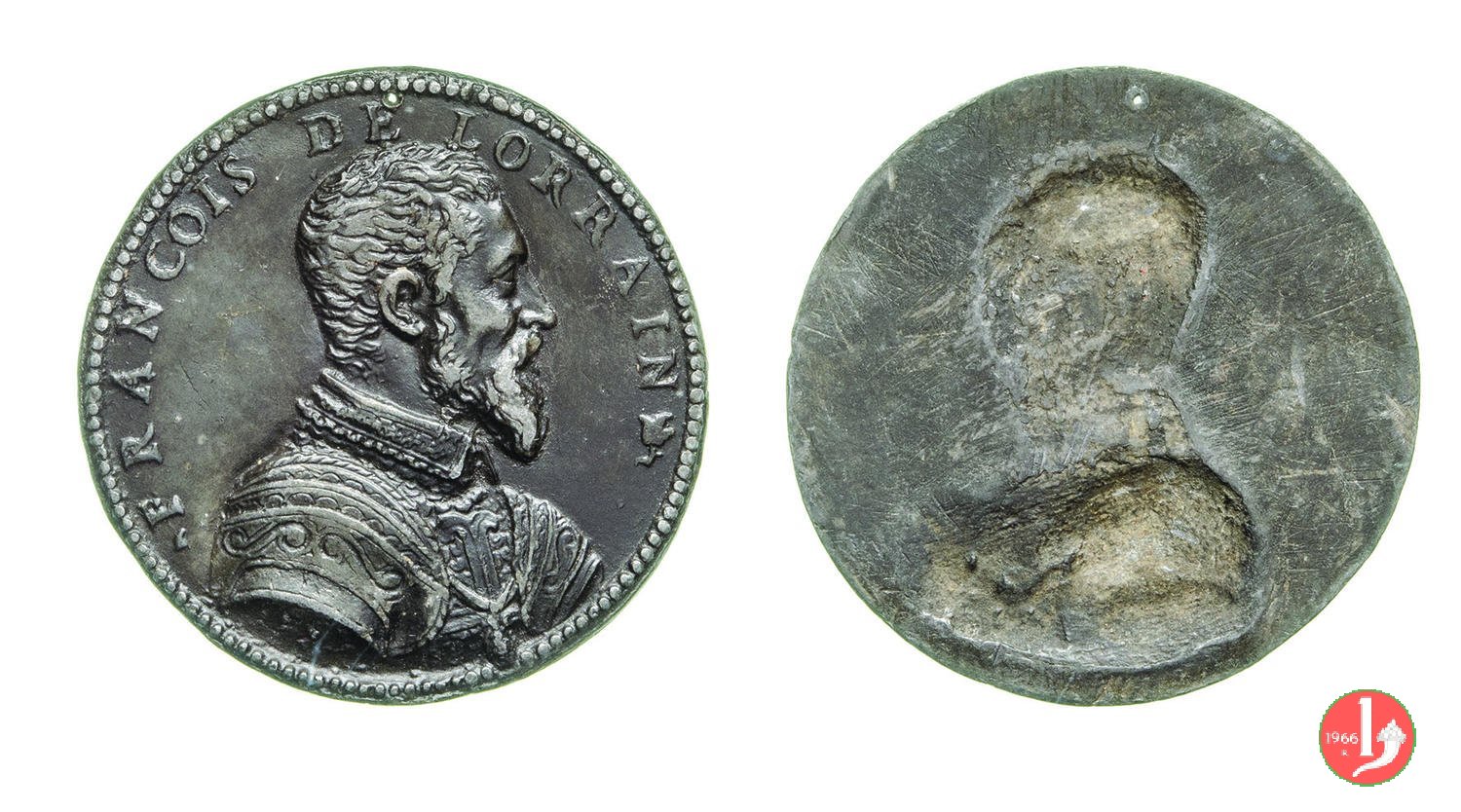 Francesco di Lorena 1557 Dritto: _ • FRANÇOIS DE LORRAIN • busto corazzato a dx con collare sul taglio spalla: 1557 P Tritone in mare trafigge naufrago, sullo sfondo imbarcazione | |