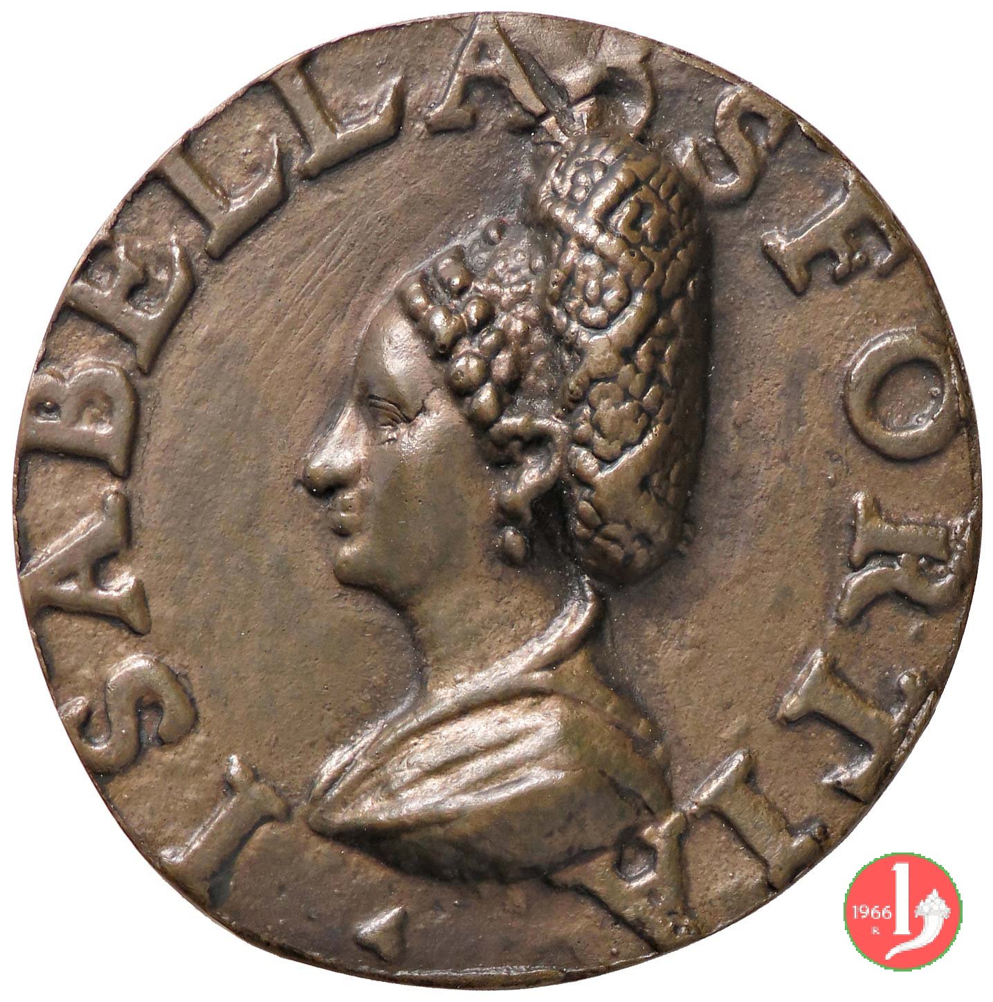 Pesaro - Isabella Sforza Dritto: ISABELLA _ SFORTIA • busto a sx con capigliatura adorna di gemme figura femminile volta a sx, regge cornucopia e mela | |