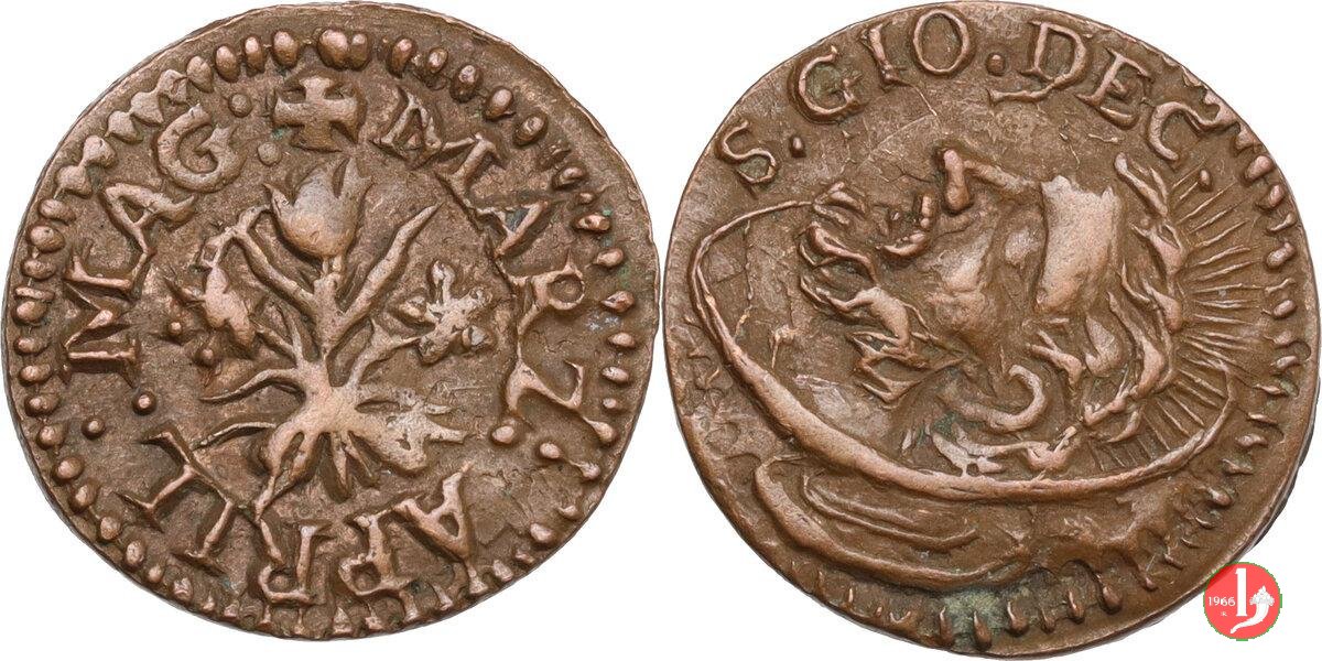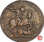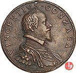 Casale - Vincenzo I Gonzaga Dritto: VINCENTIVS • GONZAGA • busto corazzato a dx con mantello sotto: GAS. MOLO F. San Giorgio a cavallo versu dx, trafigge drago in esergo: PROTEC NOSTER = ASPICE | |