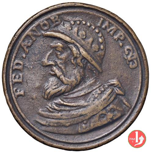 Federico Barbarossa Dritto: FED • ANON _ IMP. CVC busto a sx con berretto, corazza e mantello figura femminile assistita da paggio, seduta su asino gradiente a dx, regge la coda dell'animale |