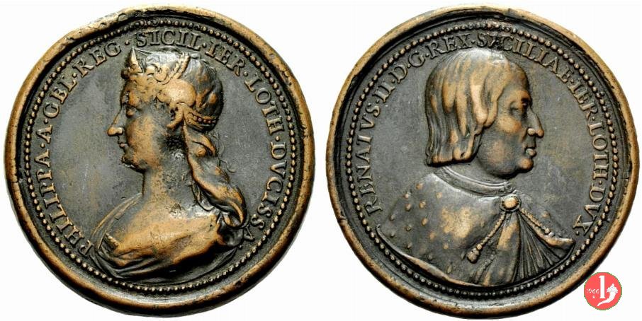 Sicilia - Renato II di Lorena e Filippina di Gheldria Dritto: RENATVS • II • G • REX • SICILIAE • IER • LOTH • DVX • busto a dx con mantellina d'ermellino busto diademato e velato a sx con capelli raccolti sul capo da trecce | |