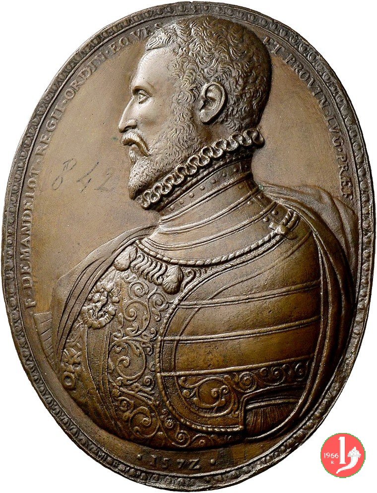 François de Mandelot-Governatore di Lione 1572 Dritto: _ • F • DEMANDELOT • REGII • ORDIN • EQVES _ ET • PROVIN • LVG • PREF busto corazzato a sx con collare alla spagnola e mantello sotto: • 1572 • | |