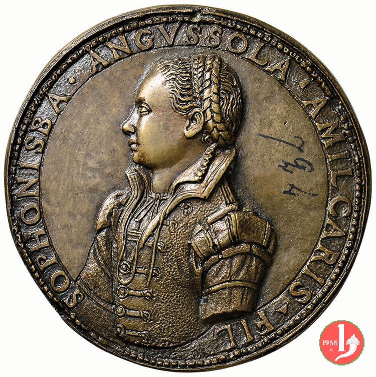 Cremona - Sofonisba Anguissola Dritto: SOPHONISBA • ANGVSSOLA • AMILCARIS • FIL busto a sx con capelli raccolti sul capo da treccia e corsetto ricamato | |