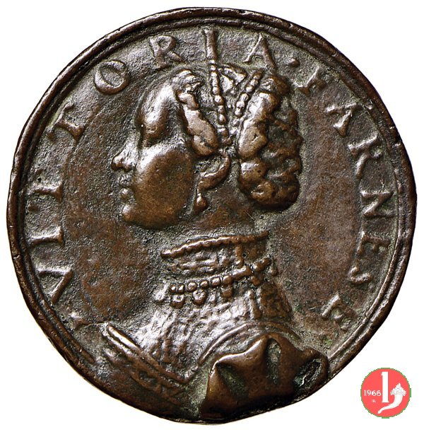 Urbino - Vittoria Farnese Dritto: VICTORIA • FARNESIA • DVX • VRBINI busto a sx con capelli raccolti sul capo sul taglio del busto: P | |