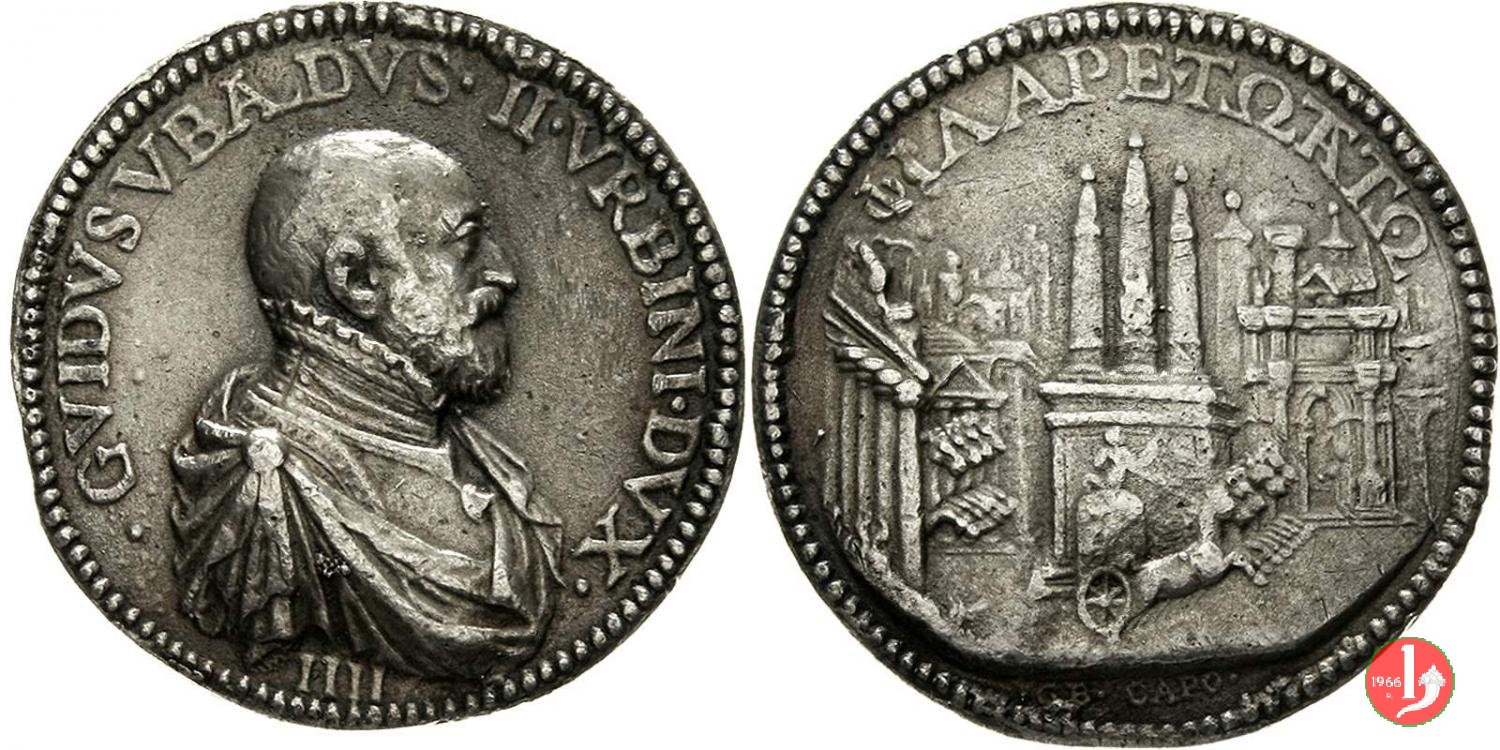Urbino - Guidobaldo II Della Rovere Dritto: _ • GVIDVSVBALDVS • II • VRBINI • DVX • _ IIII busto corazzato e paludato a dx vista di città con obelischi e quadriga briosa a dx in esergo: IGE • CAPO | |
