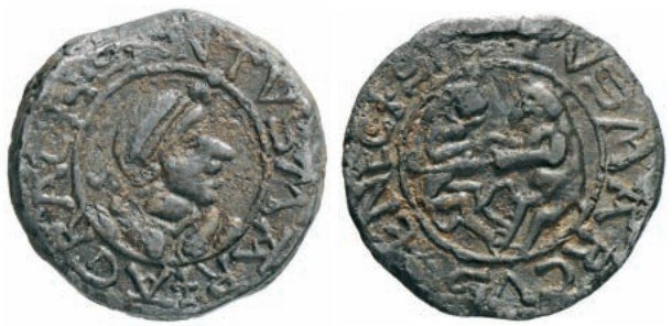 Michele Steno -V770 Dritto: MICH • _ STENO DVX VEN • busto a dx con corno dogale e manto d'ermellino | |