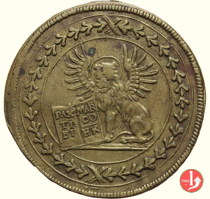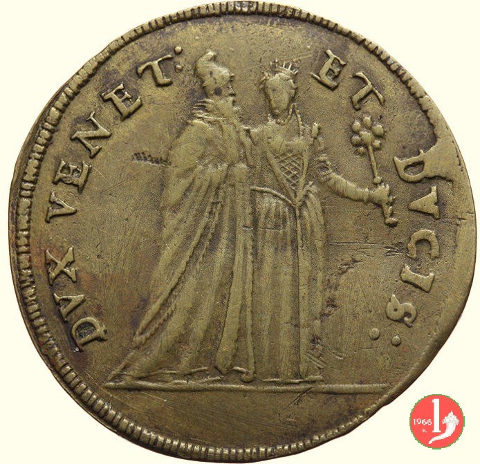 Gettone di conto -V725 Dritto: entro cornice floreale fermata da nastri incrociati, in alto e in basso: Leone di San Marco nimbato a sx, di fronte, ad ali spiegate, regge libro aperto con iscrizione: PAX = TI = BI _ MAR = CO = - = HK Verso: DVX VENET Il Doge con mantello e corno dogale e la Dogaressa coronata con scettro a fiore in piedi | |